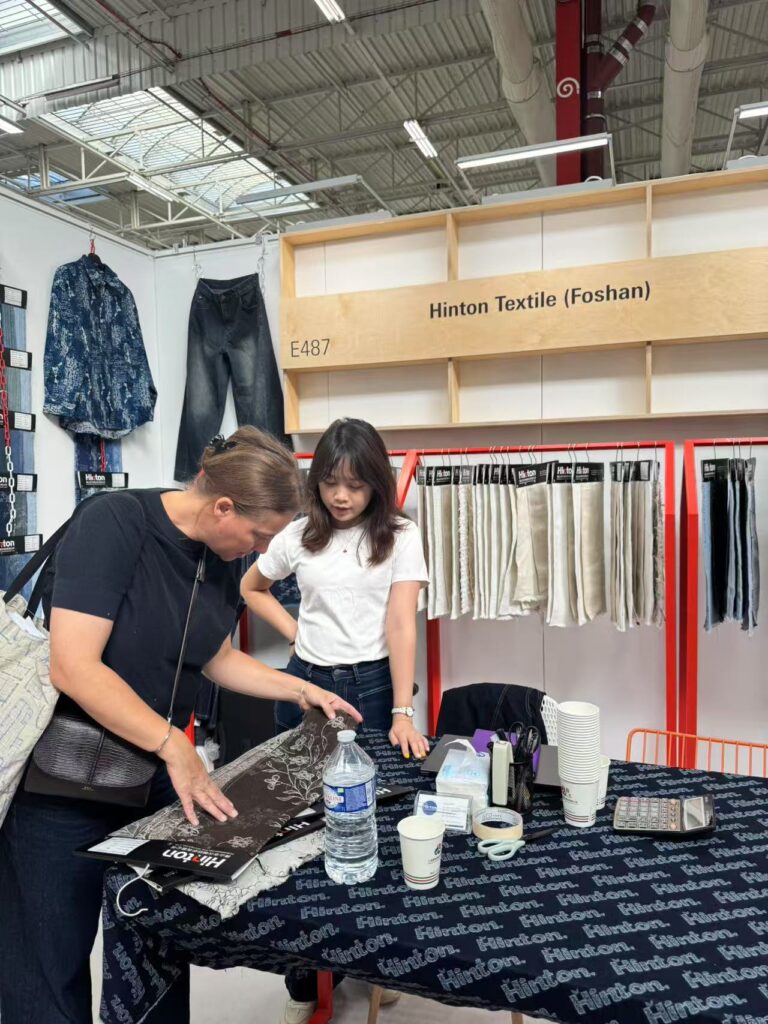 Business activities are frequent at the exhibition venue, with buyers and suppliers from various countries actively negotiating cooperation opportunities. Hinton Textile Company from Foshan, China stands out at booth E487, with booth staff engaging in in-depth exchanges with potential customers, providing detailed introductions to product specifications and cooperation plans.